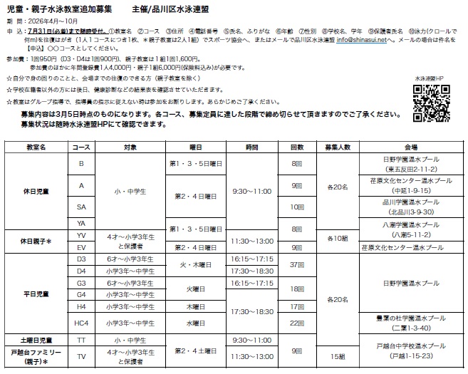品川区水泳連盟メールアドレス( info@shinasui.net )※メールの場合は件名を【申込】〇〇コースとしてください。