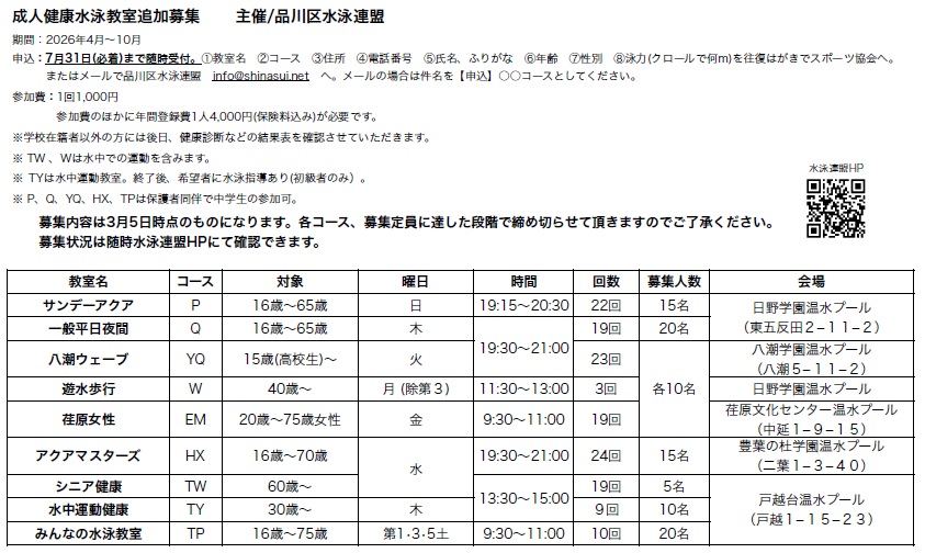 品川区水泳連盟メールアドレス( info@shinasui.net )※メールの場合は件名を【申込】〇〇コースとしてください。